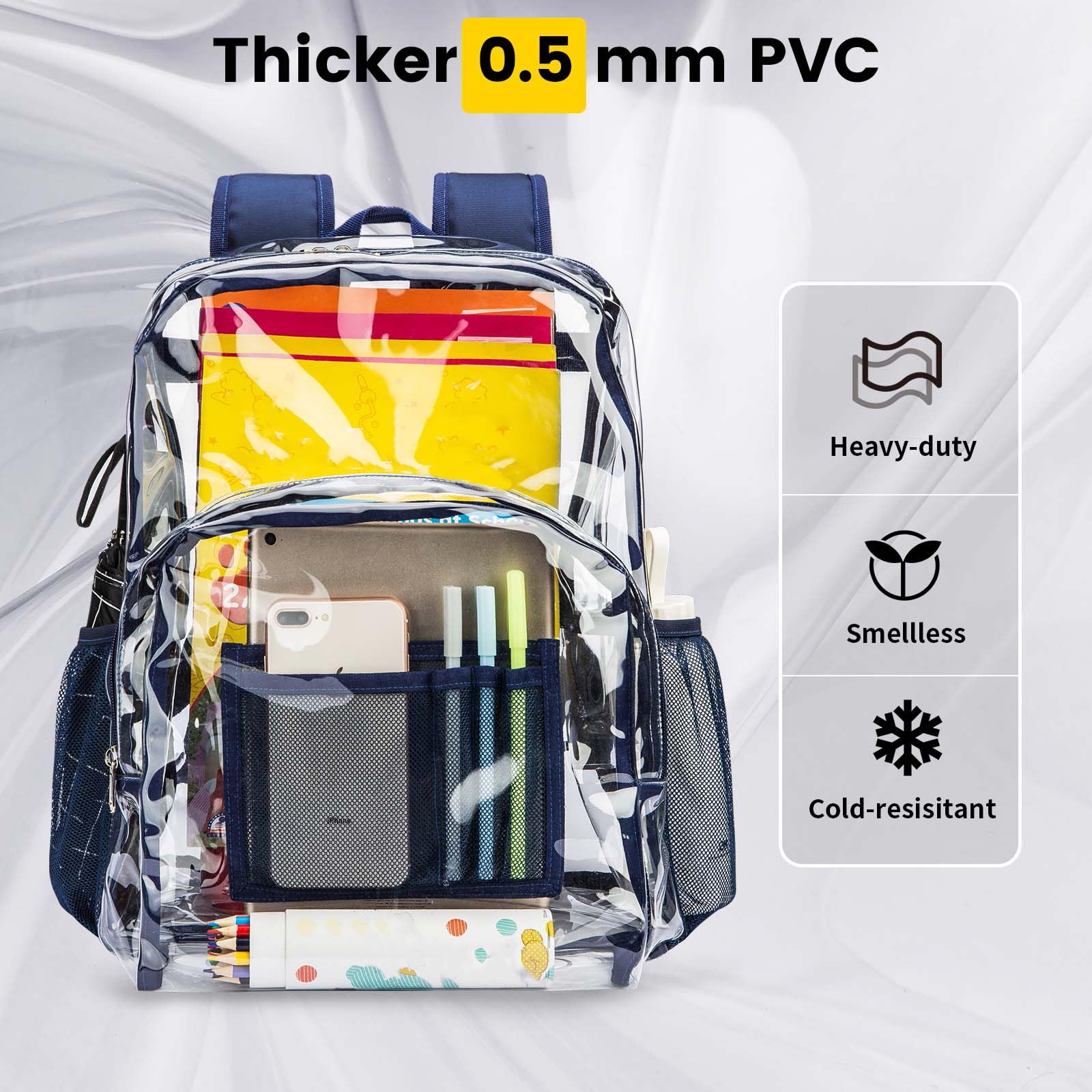Thicker PVC material: Vorspack clear bookbags are made of smell-less thicker clear PVC material, which is sturdy enough for everyday use. And, the transparent backpack is both heavy duty and soft that you can fold it as you need, it would not crack even in cold weather