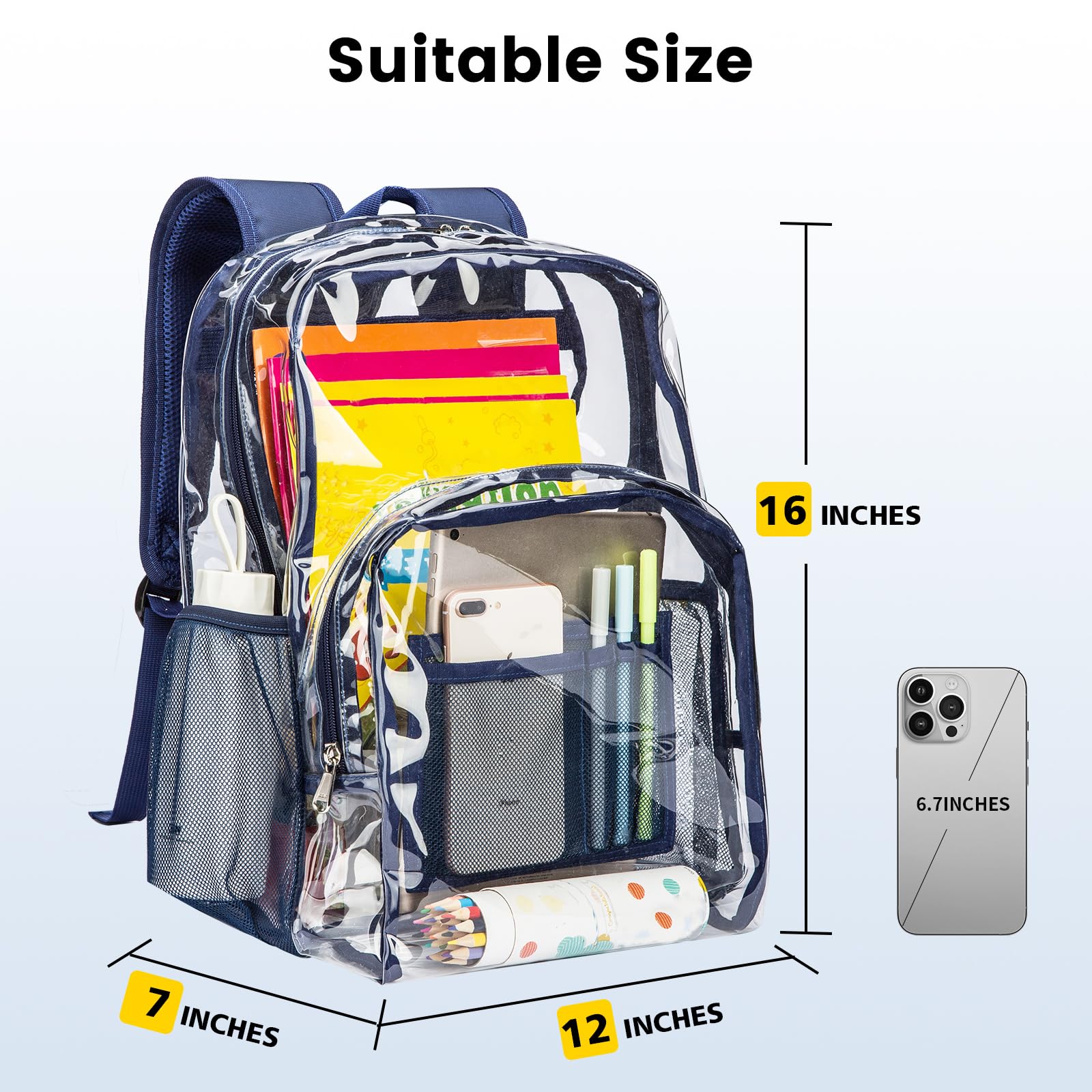 Large clear backpack: Size 16 x 12 x 7 inches, the clear bookbag has 1 large main compartment for books, with a secure zipper pocket for phone, and 1 front compartment with 4 mesh slots for pencil cases, and pens. Besides, the clear plastic backpack has 2 side mesh pockets for water bottles or umbrellas