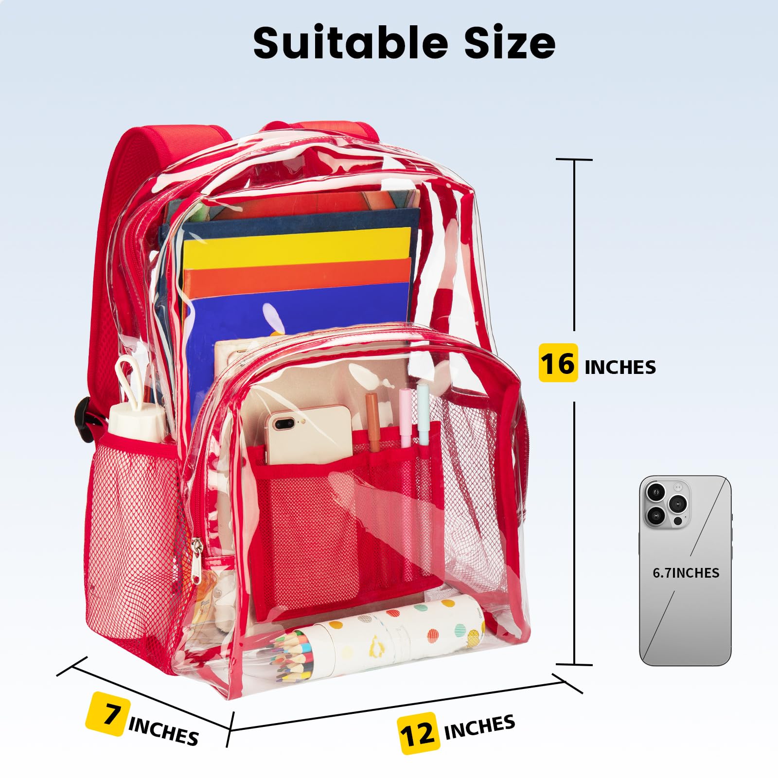 Large clear backpack: Size 16 x 12 x 7 inches, the clear bookbag has 1 large main compartment for books, with a secure zipper pocket for phone, and 1 front compartment with 4 mesh slots for pencil cases, and pens. Besides, the clear plastic backpack has 2 side mesh pockets for water bottles or umbrellas
