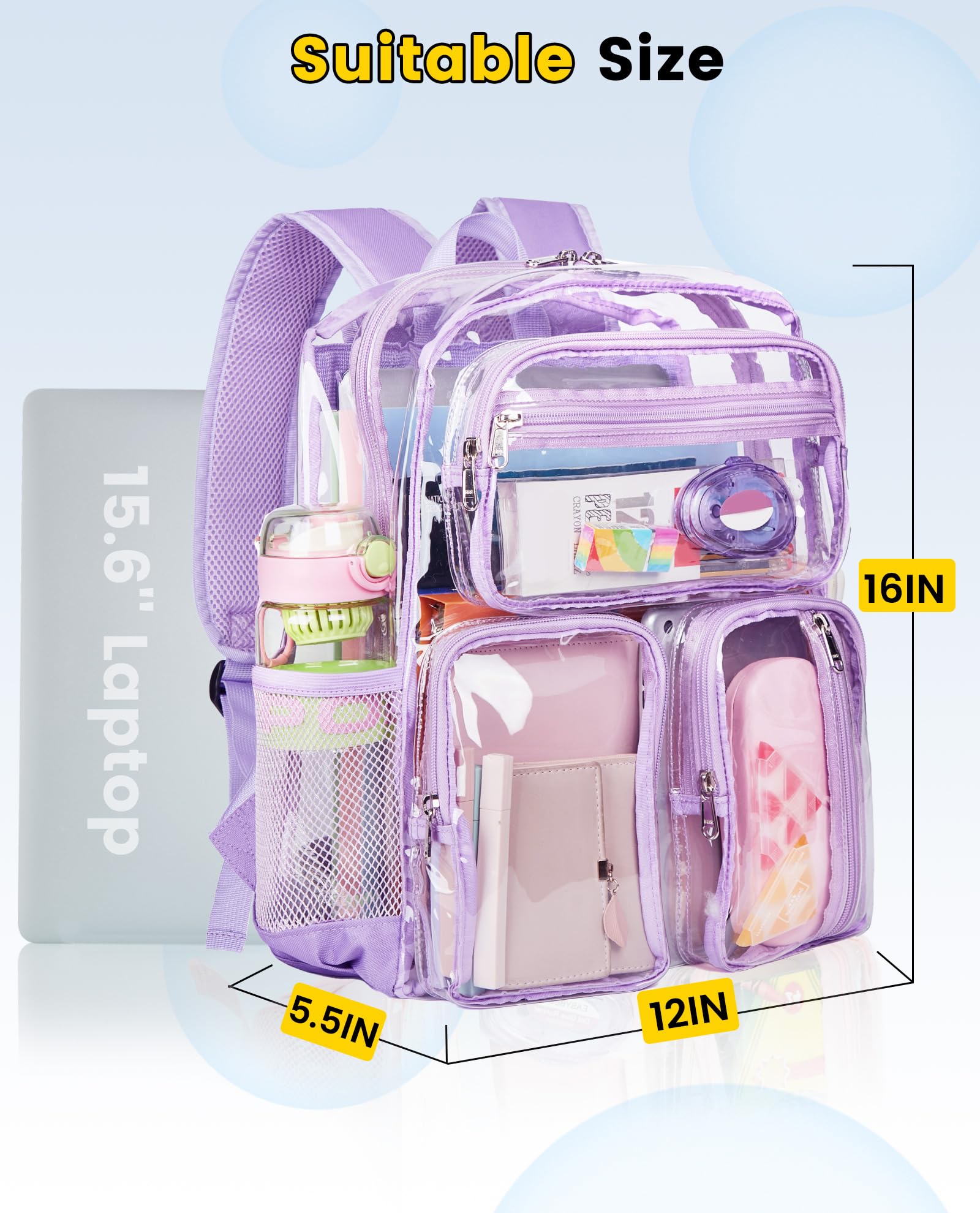 Heavy-duty clear backpack: Our clear bookbag measures 16" x 12" x 5.5". Crafted from 0.5mm thickened PVC and featuring a reinforced structure, it is sturdy and durable. The see-through backpack is suitable for school, work, and travel, as it allows for quick checks and ensures your belongings are always visible