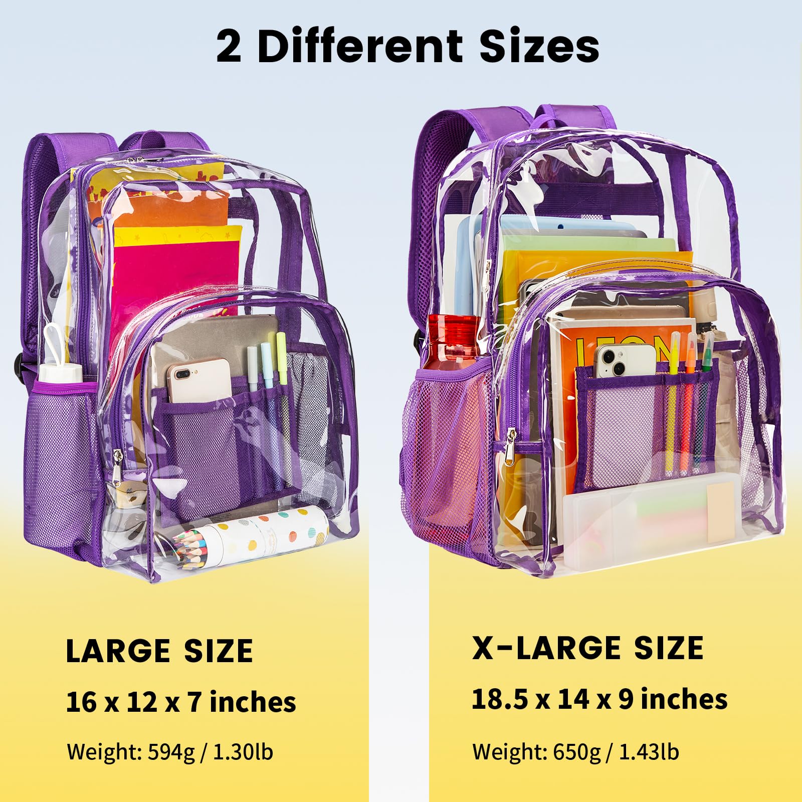 Extra large size: 18.5 x 14 x 9 inches (H x L x W); with multiple compartments for storage. Suitable for college and work, our heavy duty clear backpack allows for quick checks and easy access with its transparent design