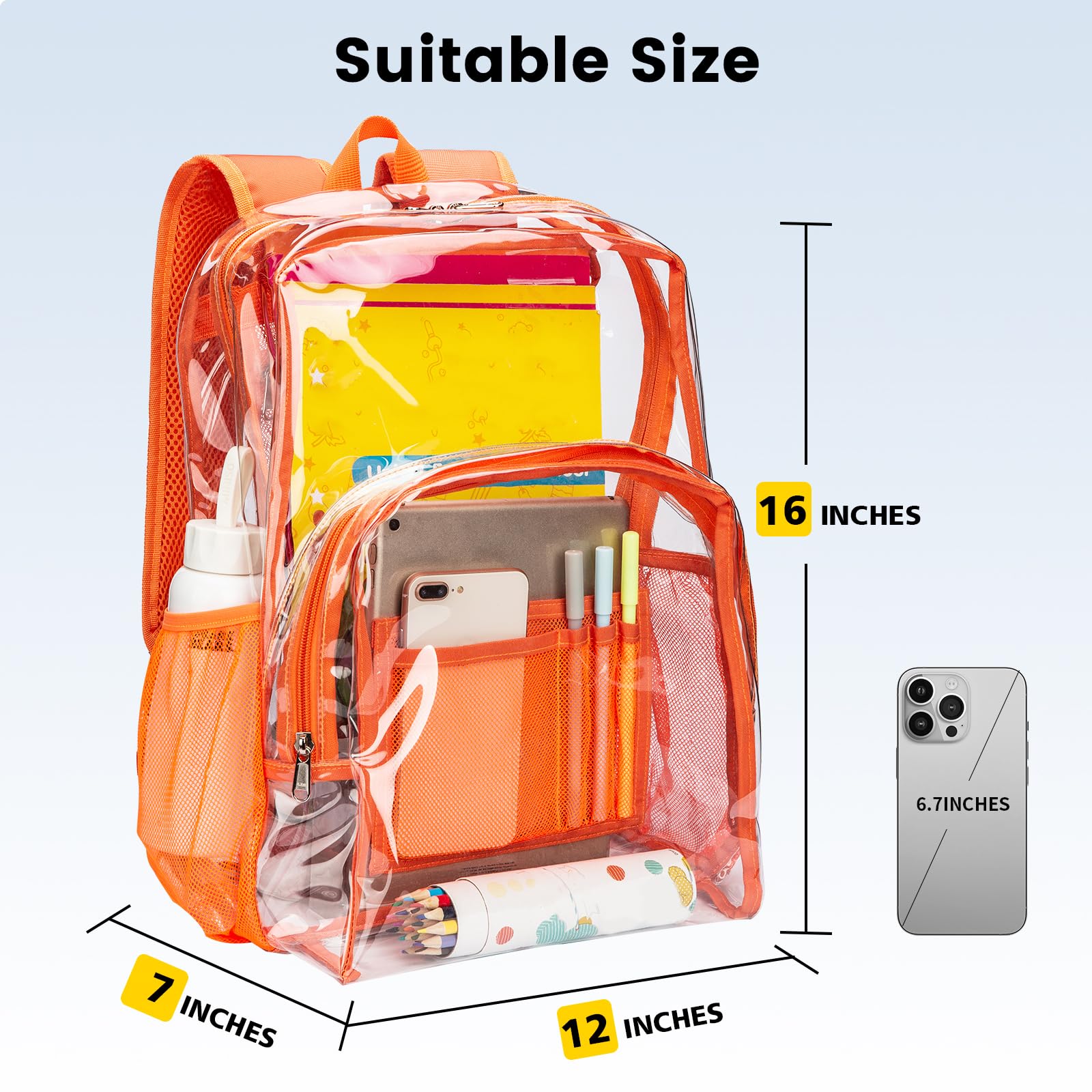 Large clear backpack: Size 16 x 12 x 7 inches, the clear bookbag has 1 large main compartment for books, with a secure zipper pocket for phone, and 1 front compartment with 4 mesh slots for pencil cases, and pens. Besides, the clear plastic backpack has 2 side mesh pockets for water bottles or umbrellas