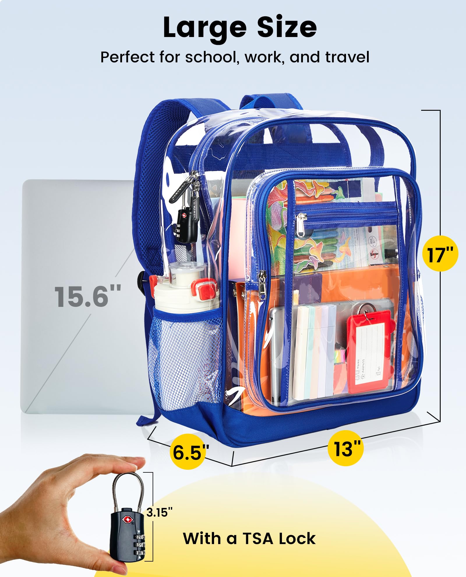 It has a TSA lock: This transparent backpack is equipped with SBS smooth zippers. The main compartment features 2 way heavy-duty zippers, providing easy access. And the clear school backpack comes with a TSA-approved lock, which enhances the security of your belongings, ensuring that your items remain safe and protected during travel