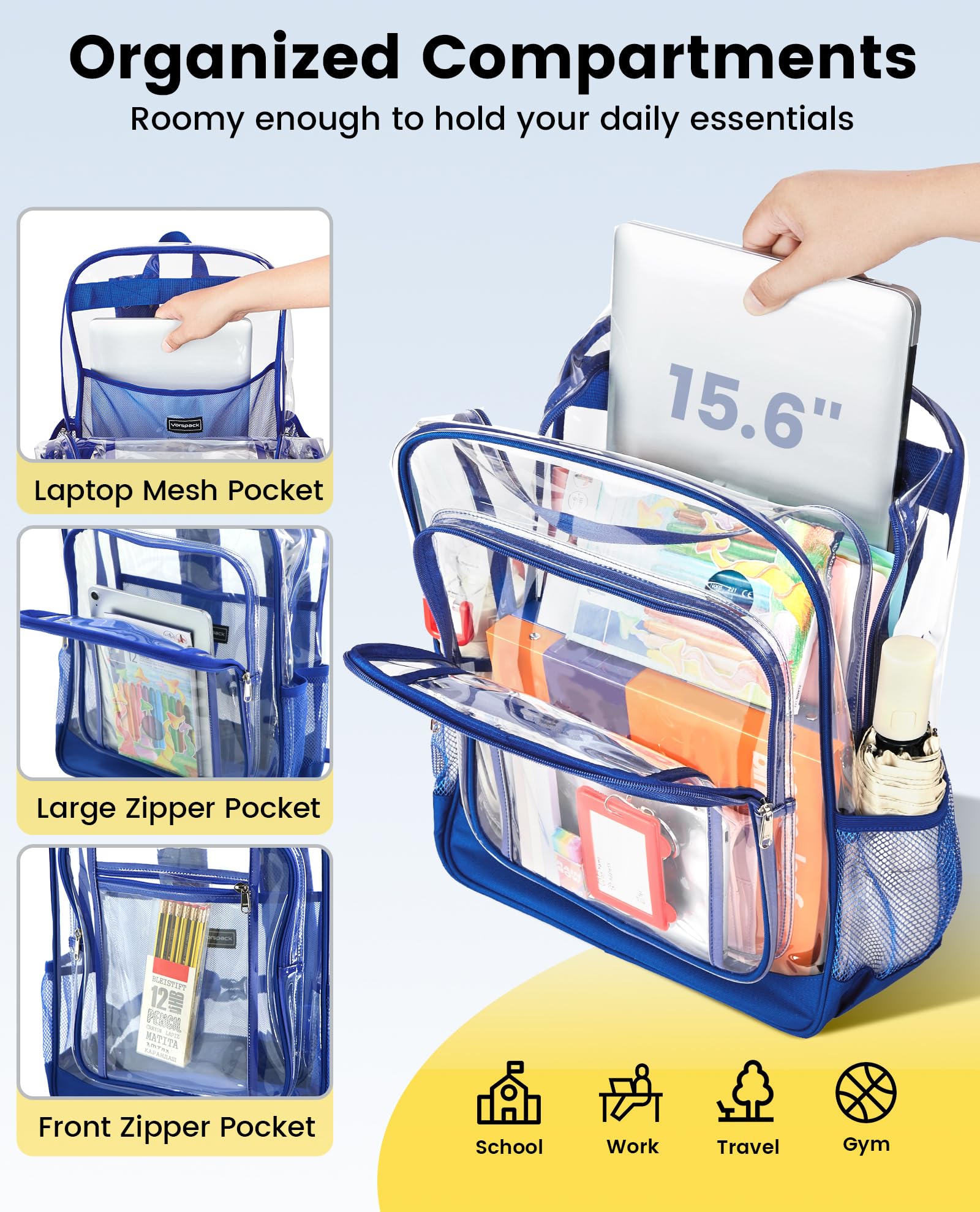 Organized compartments: The clear bookbag comes with multiple compartments to meet your storage needs. The main compartment is spacious enough to hold books and clothes. Inside, there is an insert mesh pocket for laptops. There are 2 zippered front pockets for small items such as notebooks, and 2 side pockets where you can place water bottles and umbrellas