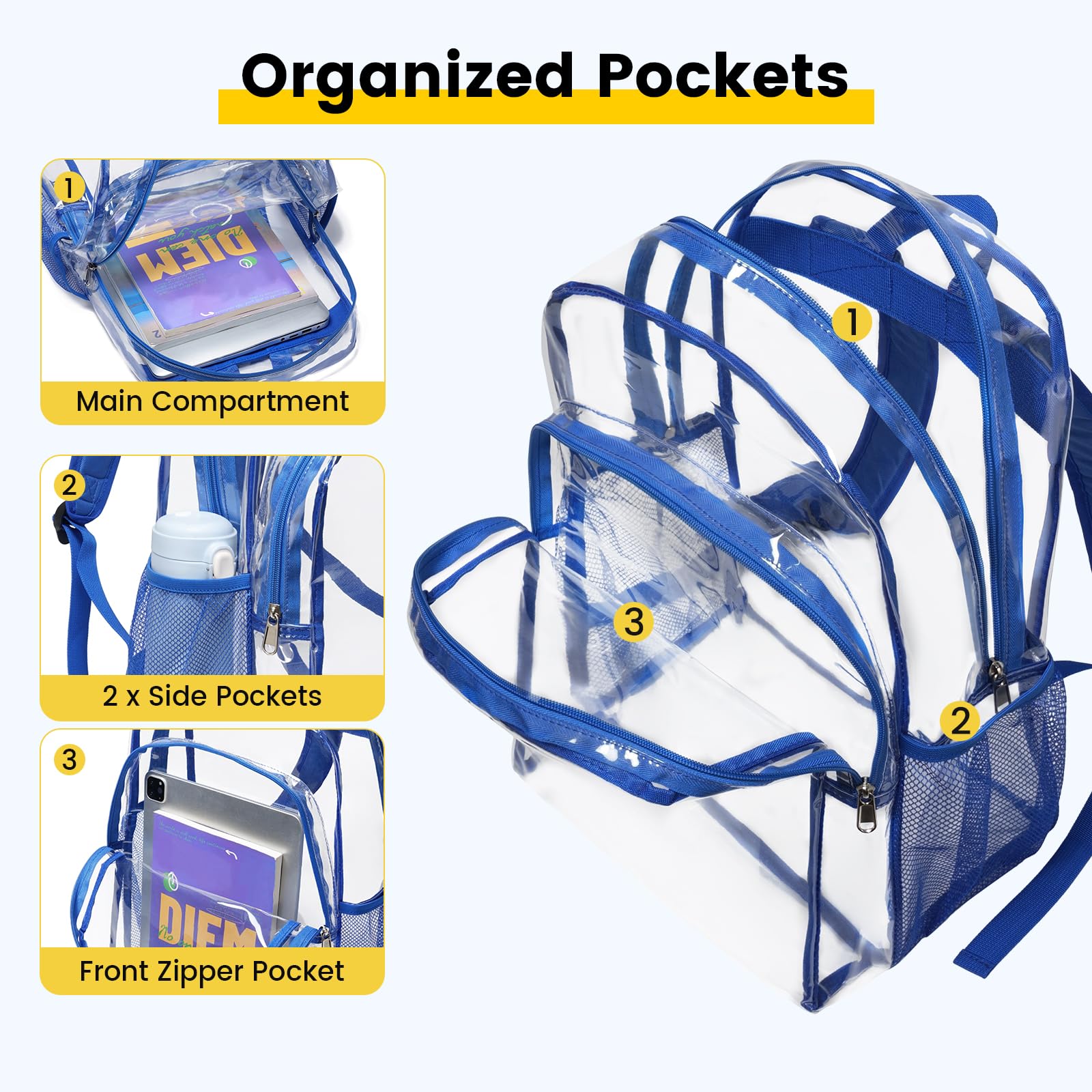 Large clear backpack: This 16" x 12" x 5.5" clear backpack for girls and boys features a large main compartment for books, clothes, and essentials, plus a front zippered pocket for quick-access items and two side mesh pockets. Stay organized whether you're at school, work, or traveling.