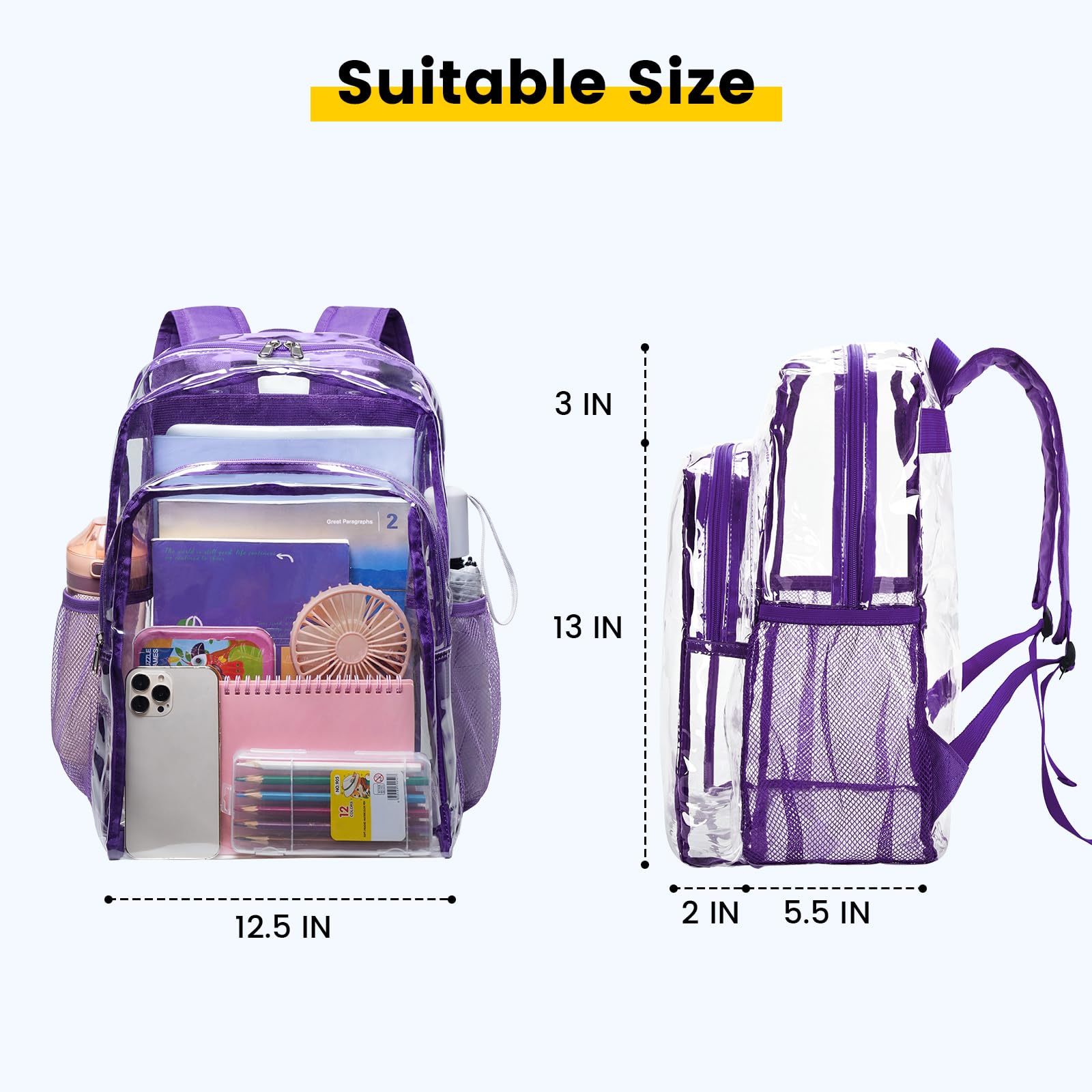 Large clear backpack: This 16" x 12" x 5.5" clear backpack for girls and boys features a large main compartment for books, clothes, and essentials, plus a front zippered pocket for quick-access items and two side mesh pockets. Stay organized whether you're at school, work, or traveling.