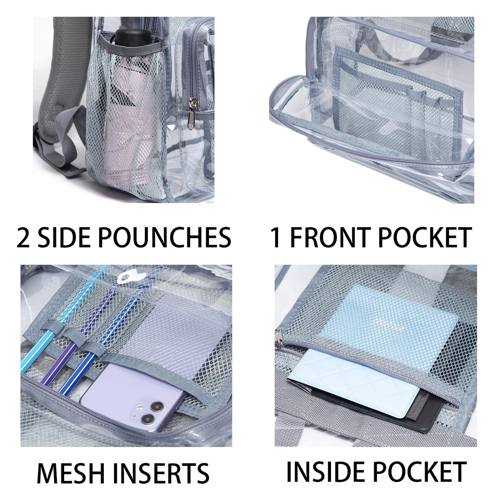 Large clear backpack: Size: 15 x 12 x 7.5 inches, the clear back pack has 1 large main compartment for books, with a secure zipper pocket for small items, and 1 front compartment with 4 mesh slots for pencil cases, and pens. Besides, the clear bookbag has 2 side mesh pouches for water bottles or umbrellas
