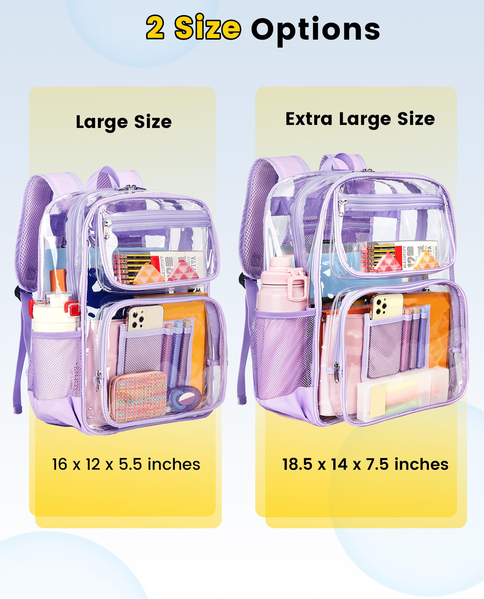 Multi-pocket design: This 16" x 12" x 5.5" clear bookbag features multiple compartments to organize school essentials. The spacious main compartment includes a double-zipper closure for storage of books and laptops, plus a convenient inner mesh pocket for quick access to phones and keys. 2 front zippered pockets hold pens and pencil cases, while the 2 side mesh pockets hold water bottles and umbrellas