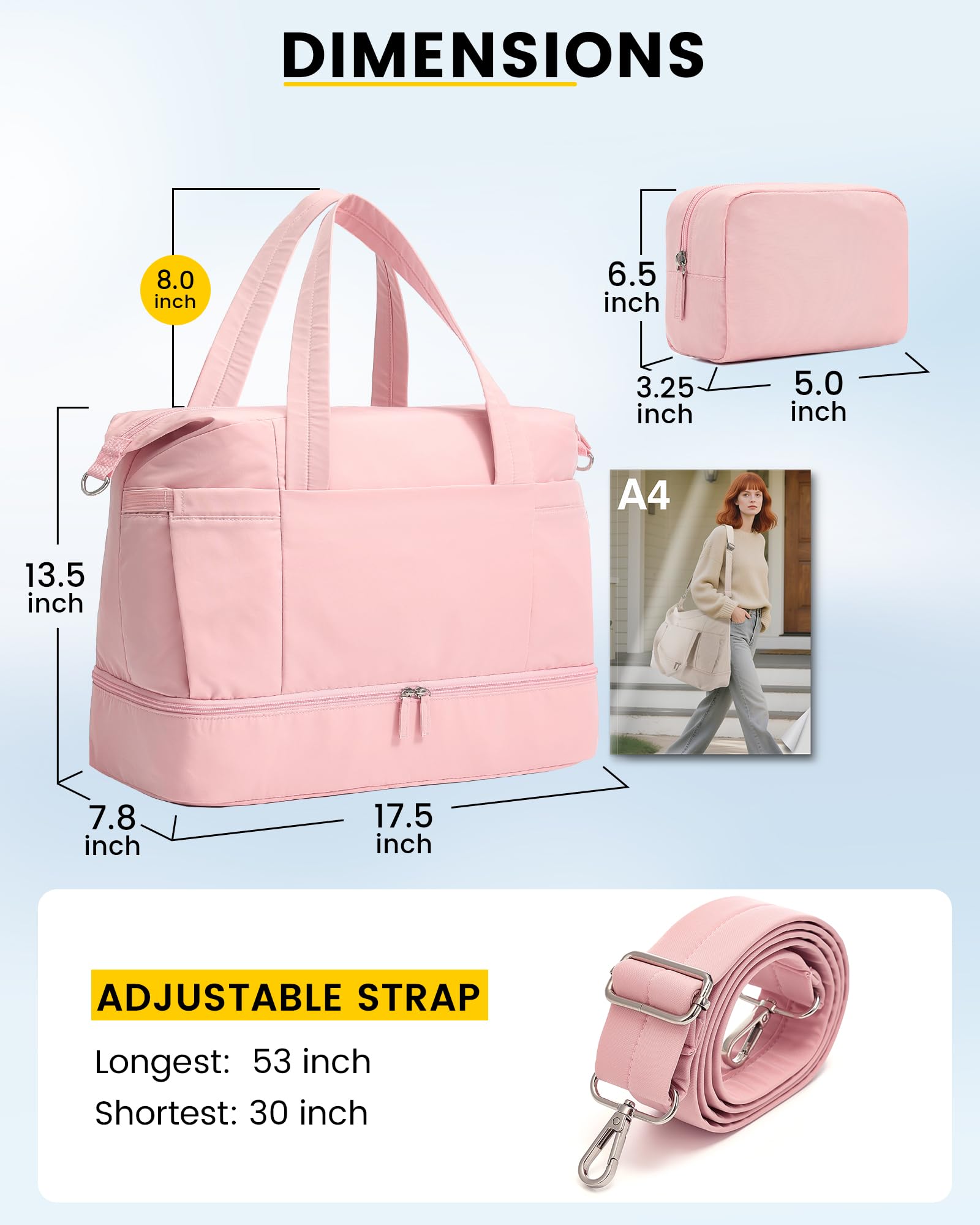 Carry on bag with shoe pocket & toiletry bag: This duffle bag for travel has a separate pocket at the bottom to store your shoes and dirty clothes, or store other items you want to keep separate. This gym bag for women comes with a small travel toiletry bag (6.5 x 3.25 x 5 inches) for your cosmetics, toiletries, shaving kits, or other small items