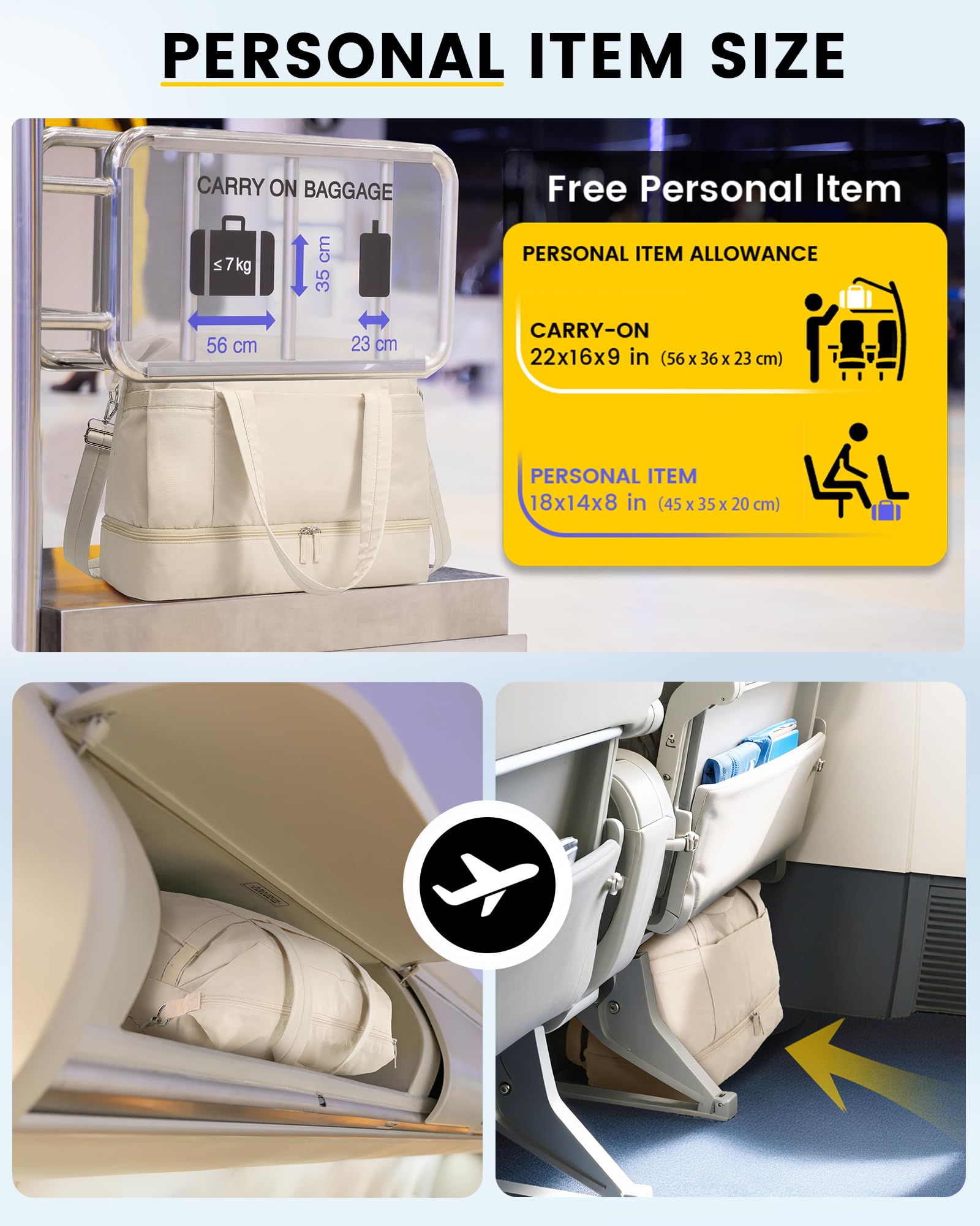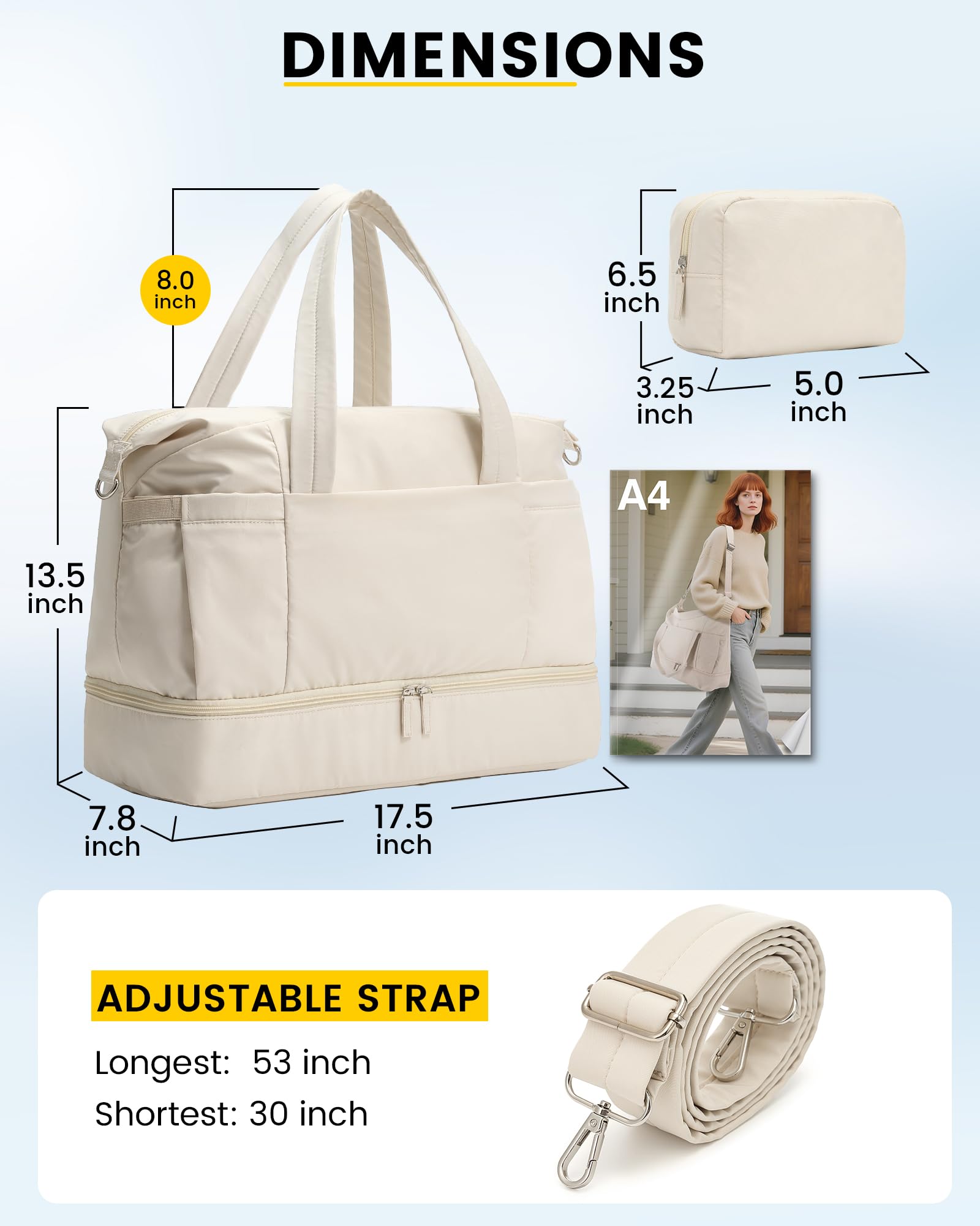Carry on bag with shoe pocket & toiletry bag: This duffle bag for travel has a separate pocket at the bottom to store your shoes and dirty clothes, or store other items you want to keep separate. This gym bag for women comes with a small travel toiletry bag (6.5 x 3.25 x 5 inches) for your cosmetics, toiletries, shaving kits, or other small items