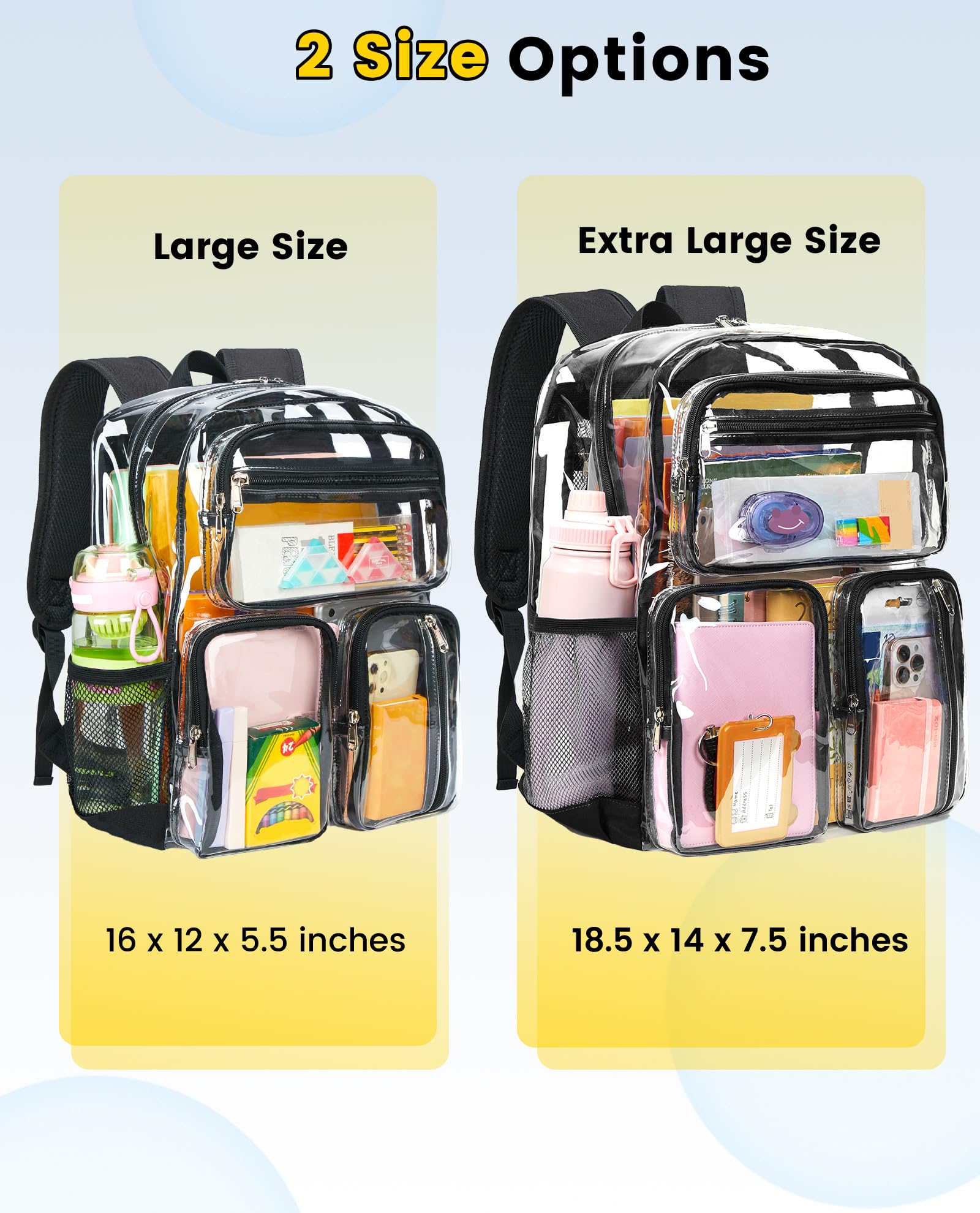 Heavy-duty clear backpack: Our extra large clear bookbag measures 18.5" x 14" x 7.5". Crafted from 0.5mm thickened PVC and featuring a reinforced structure, it is sturdy and durable. The see-through backpack is suitable for school, work, and travel, as it allows for quick checks and ensures your belongings are always visible