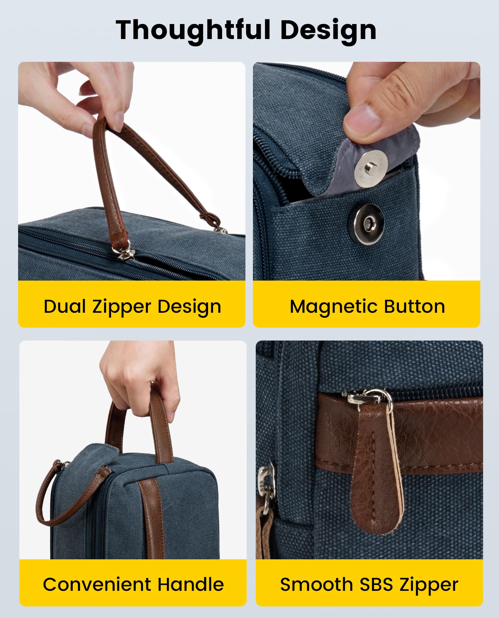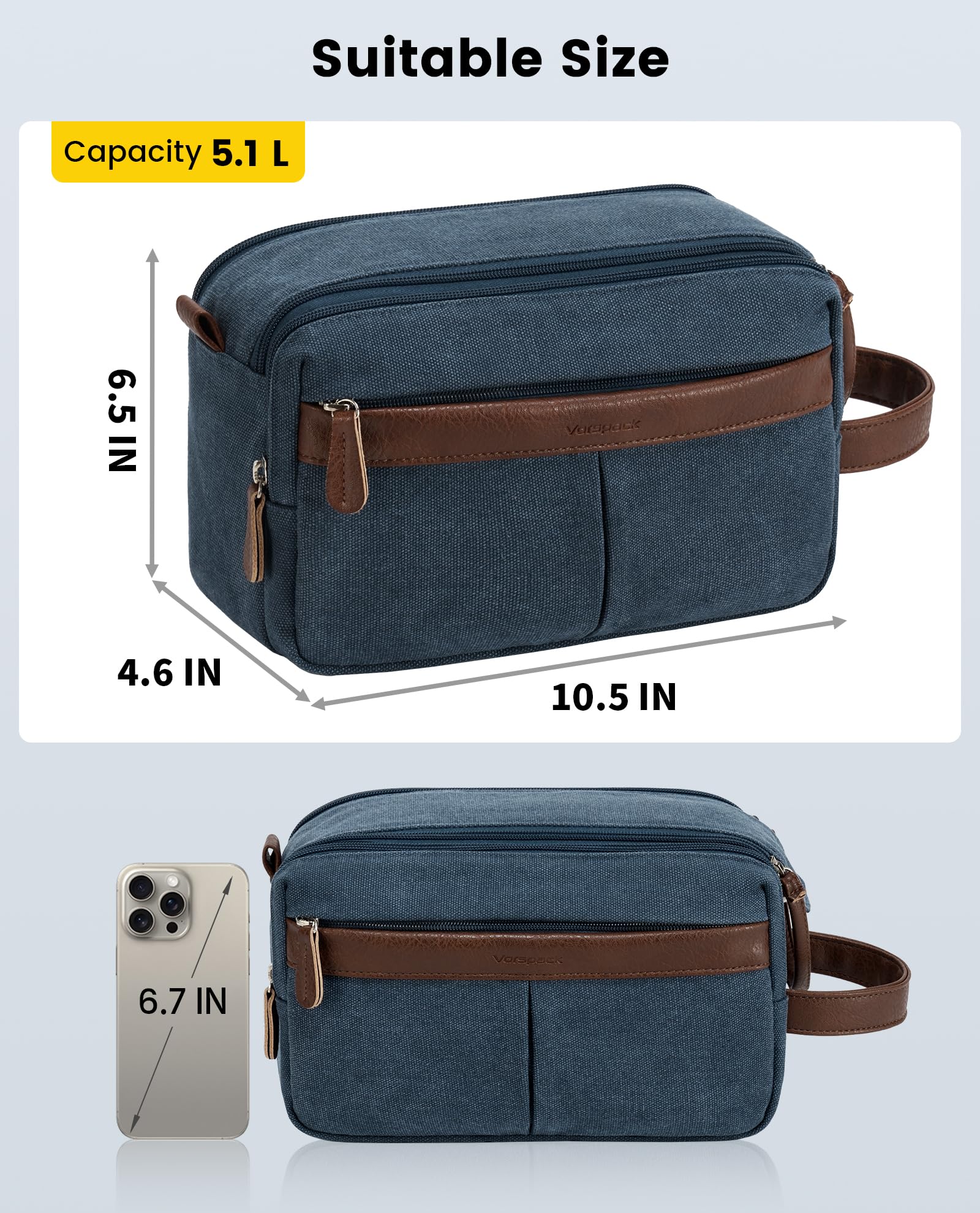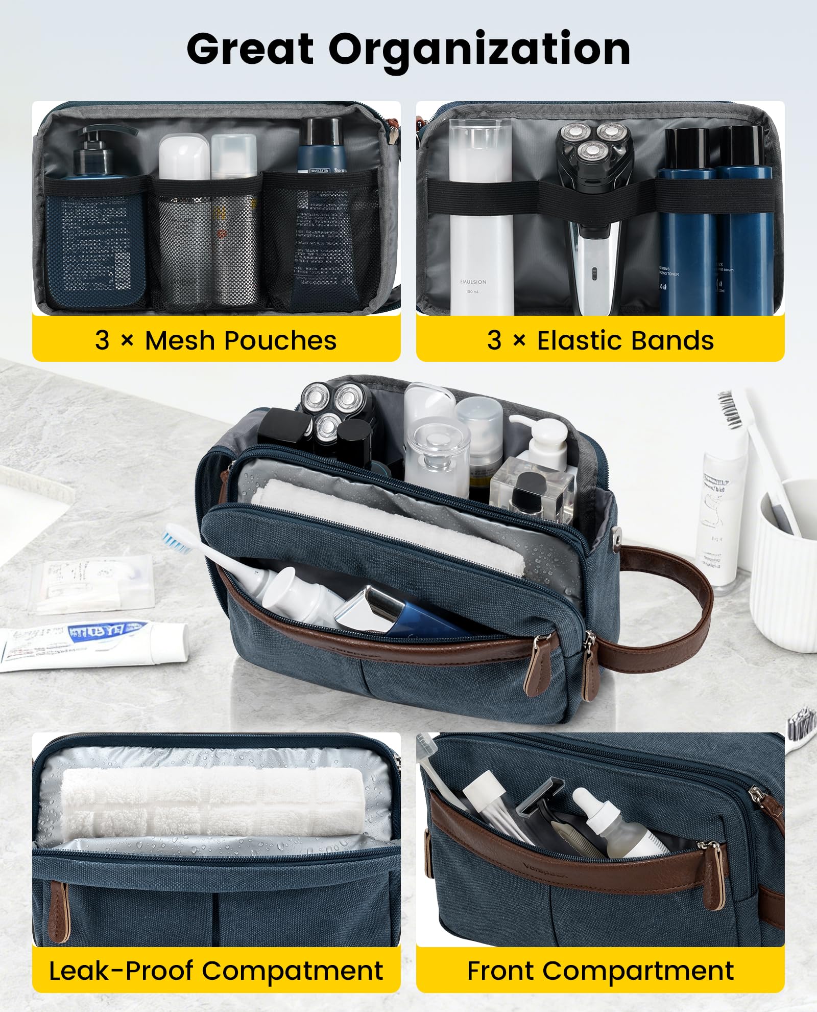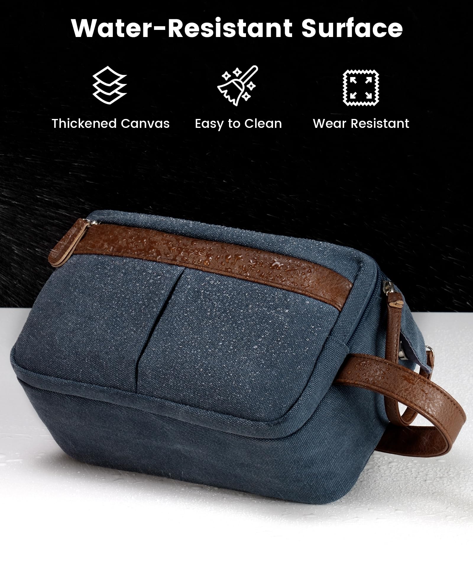 Vorspack Canvas Toiletry Bag for Men - Water Resistant Travel Bag for Toiletries, Bathroom Essentials, Accessories - Navy Blue