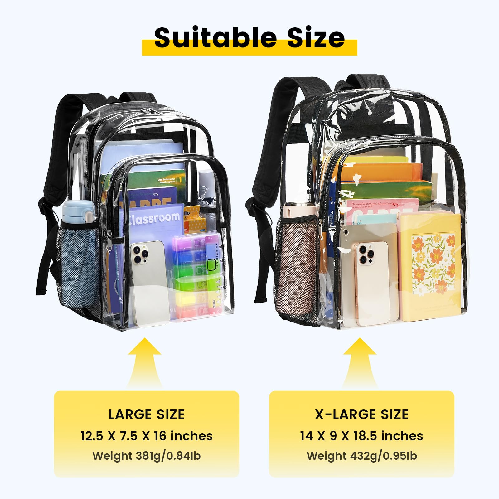Extra large clear backpack: This 18.5" x 14" x 9" clear backpack for girls and boys features a large main compartment for books, clothes, and essentials, plus a front zippered pocket for quick-access items and two side mesh pockets. Stay organized whether you're at school, work, or traveling.