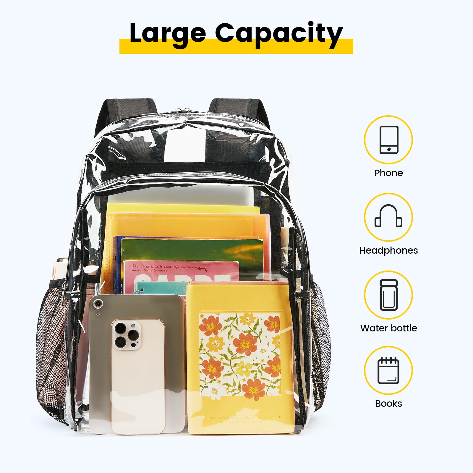 Extra large clear backpack: This 18.5" x 14" x 9" clear backpack for girls and boys features a large main compartment for books, clothes, and essentials, plus a front zippered pocket for quick-access items and two side mesh pockets. Stay organized whether you're at school, work, or traveling.