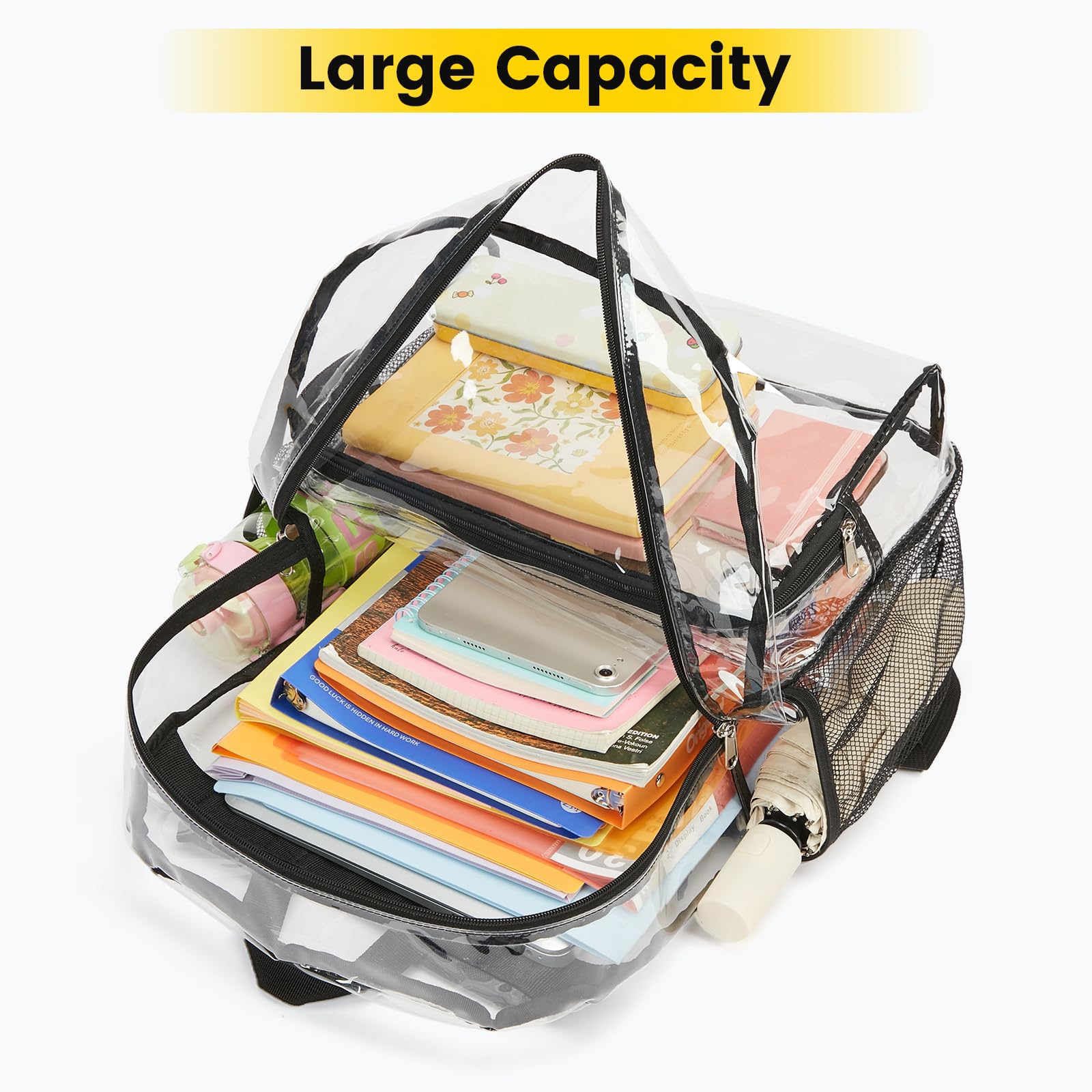 Large clear backpack: Measuring 18.5" x 14" x 9", this clear backpack for girls and boys features a roomy main compartment for books and clothes. The see-through backpack also includes a front pocket for small items and two side mesh pockets for water bottles or umbrellas.