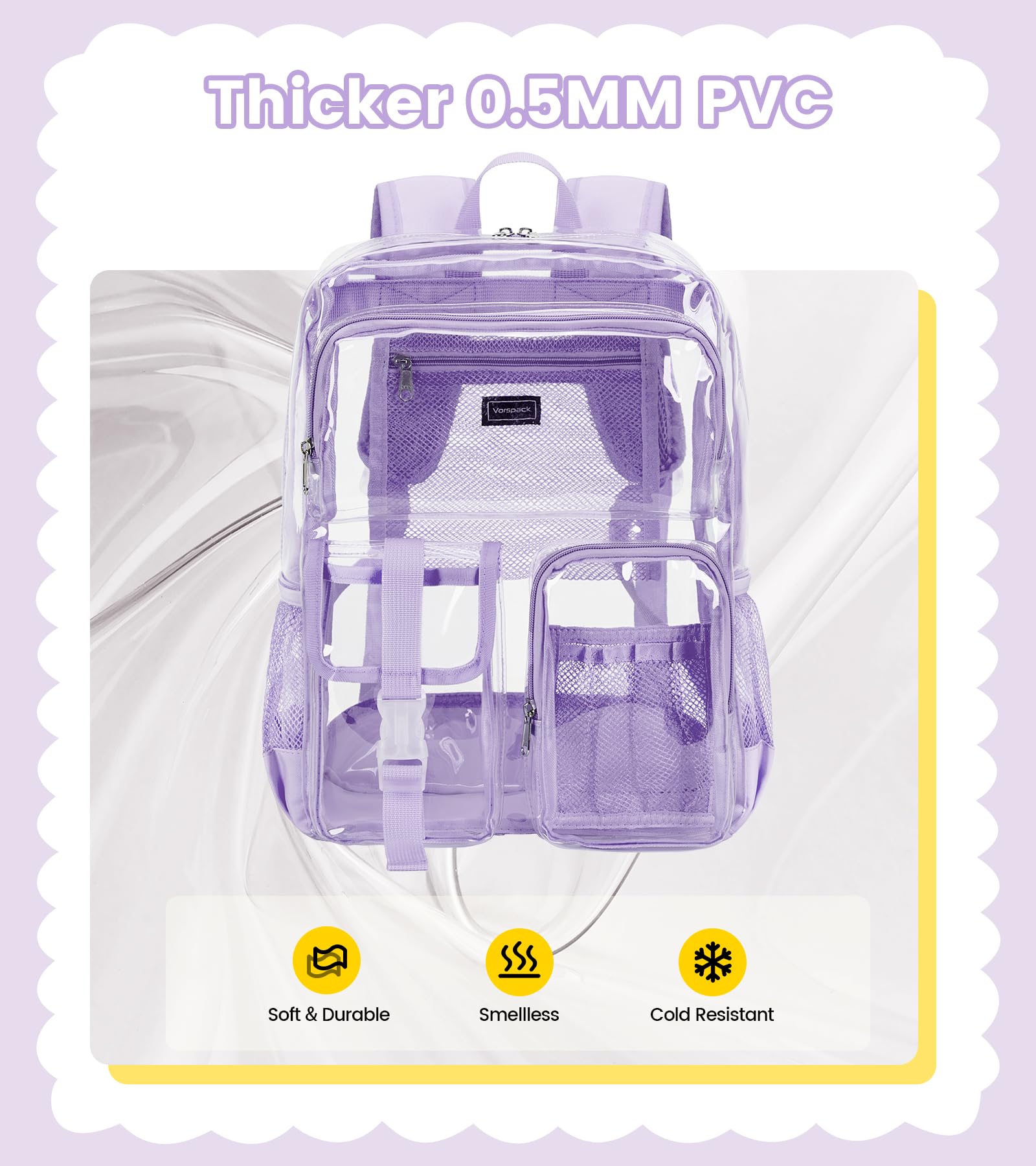 Multipurpose use: The Vorspack heavy-duty clear backpack comes in 7 colors and 2 sizes, perfect for women and men. Designed to be multi-functional, it works great as a college bookbag, travel backpack, work bag, personal item bag, or daily essentials backpack