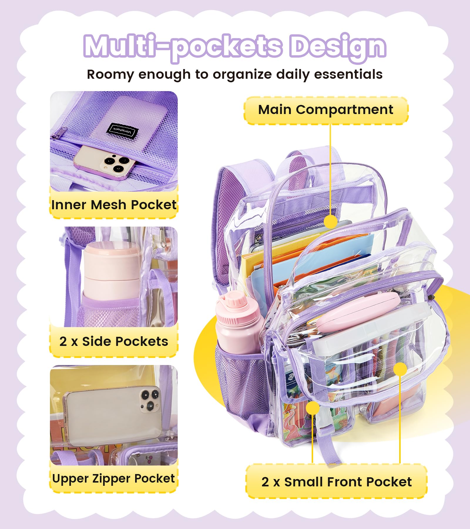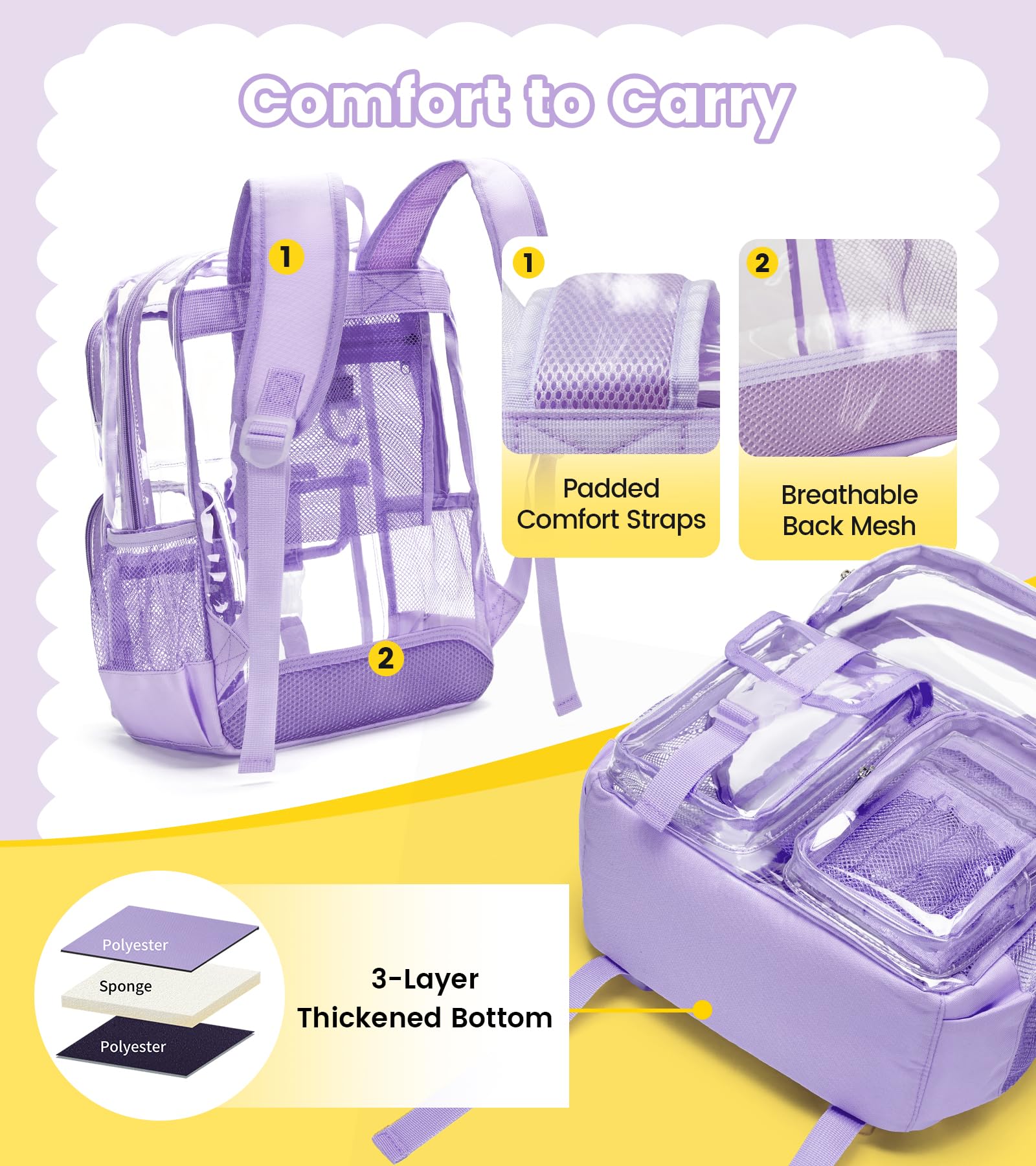 Comfortable shoulder straps & Sturdy bottom: The clear backpack features wide, cushioned shoulder straps that relieve shoulder pressure when carrying heavy supplies. The base of the clear backpacks is made of 600D polyester and reinforced padding for enhanced load-bearing capacity