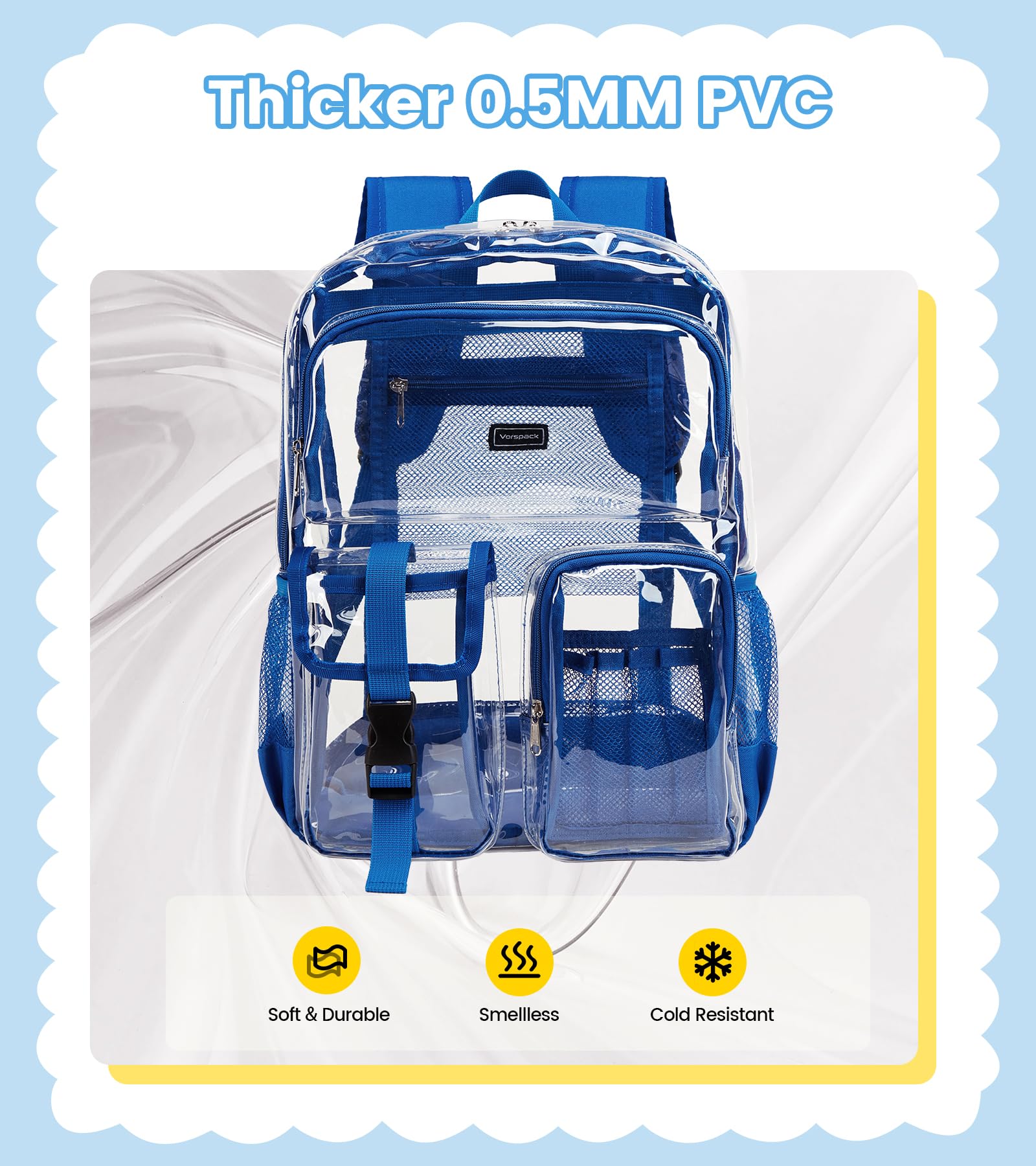 Enhanced Structure: Constructed from heavy-duty 0.5mm thick PVC material, this clear backpack is water-resistant and cold-resistant. Reinforced with sturdy polyester and double-stitched seams, it maintains its shape and stays durable for long-time use. The see-through backpack enables quick security checks while keeping your belongings clearly visible