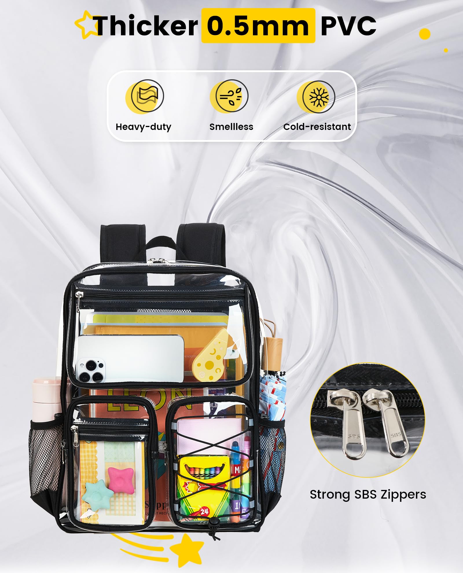 Quality Material & Reinforced Structure: Made of heavy-duty, 0.5mm-thick PVC and strong SBS zippers, these clear backpacks for school are water-resistant and built to last. Integrated support strips help the cute clear backpack maintain its shape and stand upright, even when lightly packed, making it easier to find your items quickly