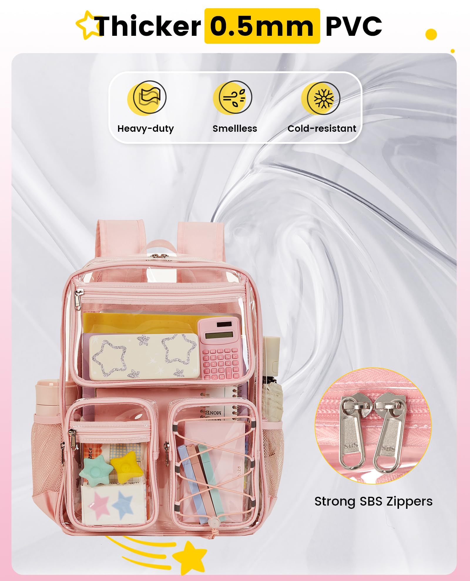 Quality Material & Reinforced Structure: Made of heavy-duty, 0.5mm-thick PVC and strong SBS zippers, these clear backpacks for school are water-resistant and built to last. Integrated support strips help the cute clear backpack maintain its shape and stand upright, even when lightly packed, making it easier to find your items quickly