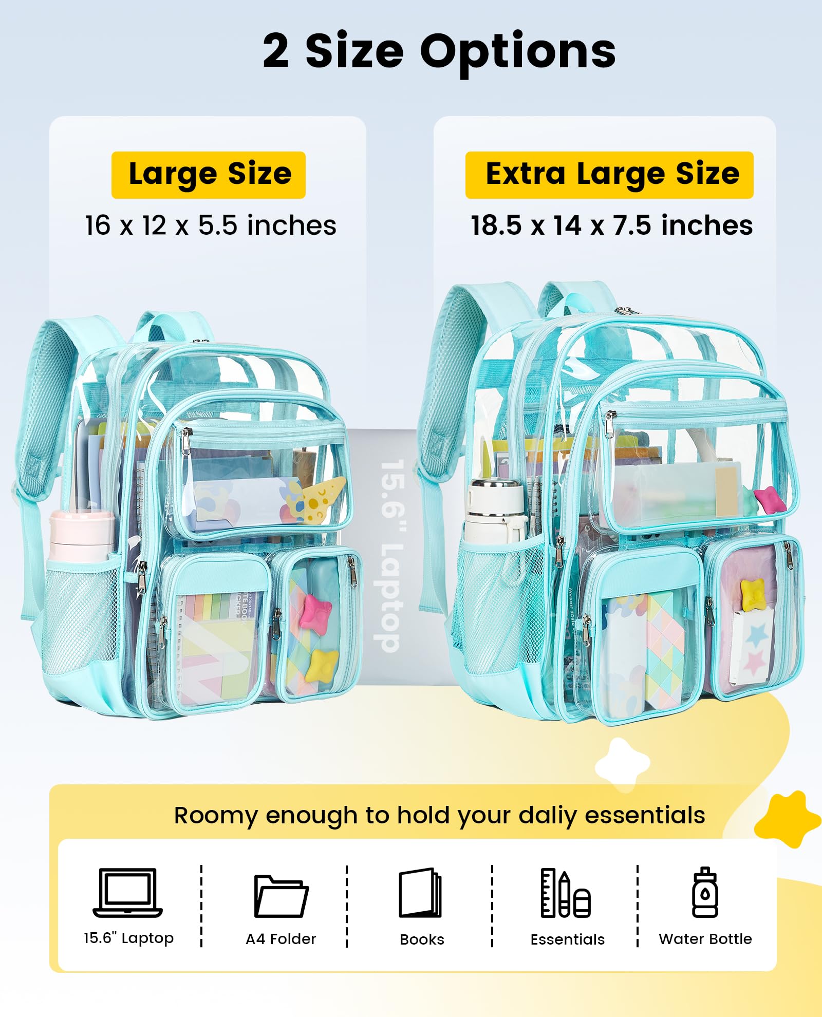 2 Size Options: Choose the transparent backpack that fits your needs. The large size (16" x 12" x 5.5") is suitable for young students, while the extra-large size (18.5" x 14" x 7.5") is ideal for teens and adults. Both can hold school supplies, daily essentials, or travel items. The see through design ensures quick security checks and easy visibility of contents. Durable and convenient for everyday use