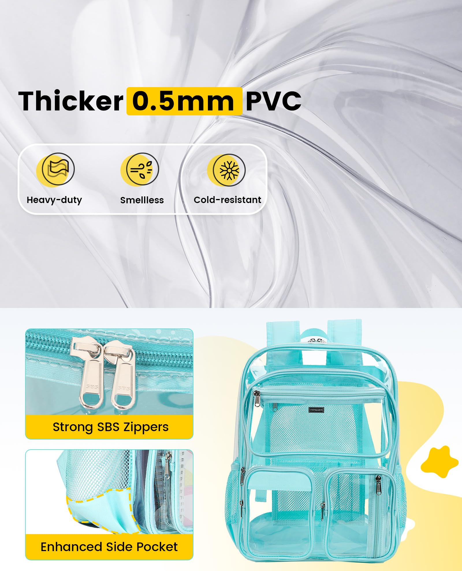 Reinforced Structure & Quality Material: Designed with built-in support strips, this heavy-duty see through backpack stands upright on its own and maintains its shape even when empty, staying sturdy and structured. The clear backpacks for school are made from smellless 0.5mm thick PVC, features reinforced stitching, and uses strong SBS zippers