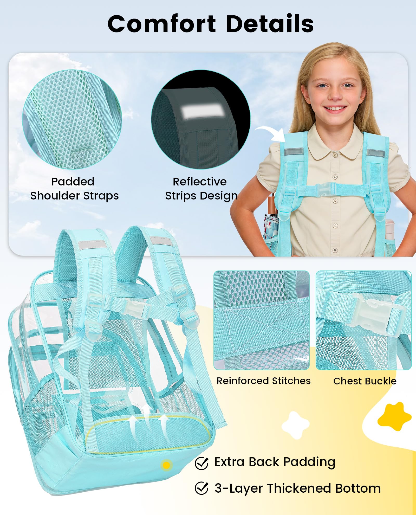 Comfort & Reflective Strips Design: This heavy-duty clear school backpack features a thickened 3-layer polyester bottom for enhanced load capacity. Its S-shaped padded shoulder straps with chest buckle effectively reduce shoulder pressure for carrying. Reflective strips on the straps improve visibility and safety for nighttime or after-school use