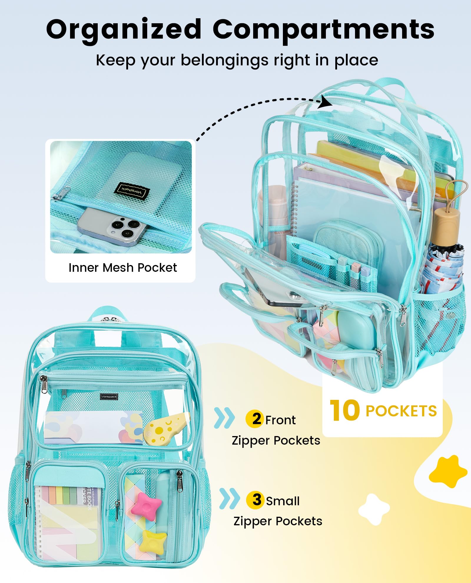 Organized Bookbag with 10 Pockets: This clear backpack for girls and boys features a functional multi-pocket design to organize your essentials. It includes a spacious main compartment with a mesh zipper pocket, a big middle compartment with 4 pouches, a front section with 4 zipper pockets for small items, and 2 side pockets for an umbrella or water bottle