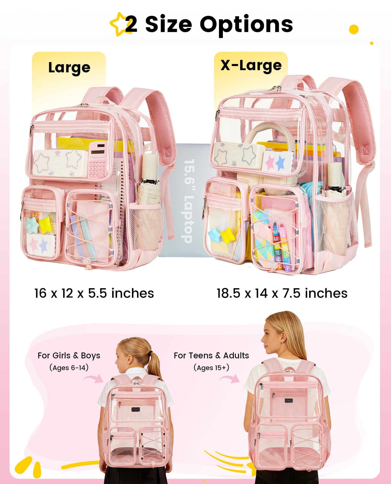 2 Size Options: Choose the right size transparent backpack to fit your needs. The large size (16" x 12" x 5.5") is suitable for elementary and middle school students. The extra large size (18.5" x 14" x 7.5") is ideal for high school students, college students, and adults. Both sizes are designed to accommodate school supplies, daily essentials, or travel items