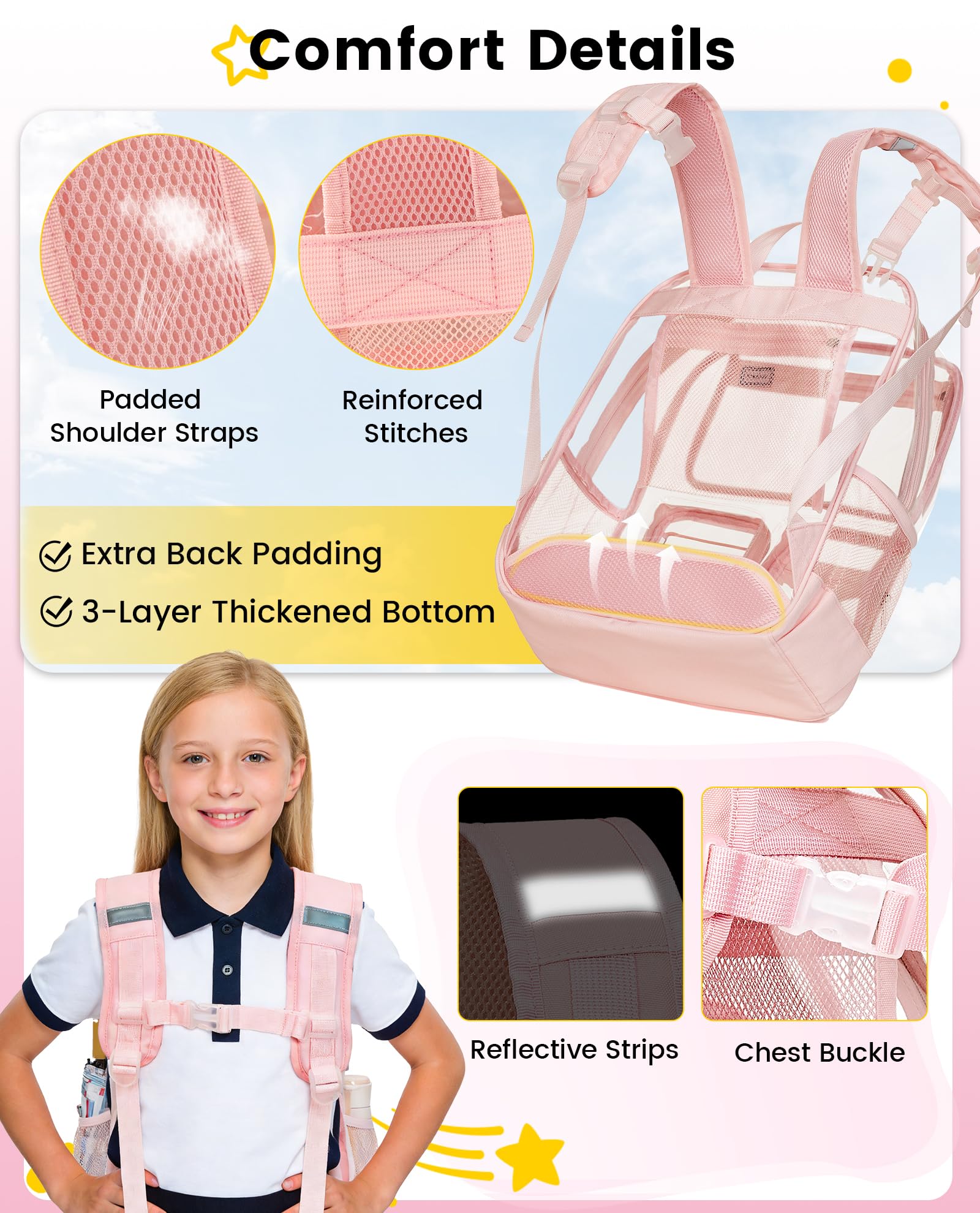 Comfort & Night Safety Backpacks: This see through backpack has a heavy-duty, 600D fabric-reinforced bottom. Reflective strips on the drawstring and shoulder straps improve visibility at night or after school. S-shaped padded shoulder straps paired with a chest strap evenly distribute weight, effectively relieving shoulder pressure for carrying