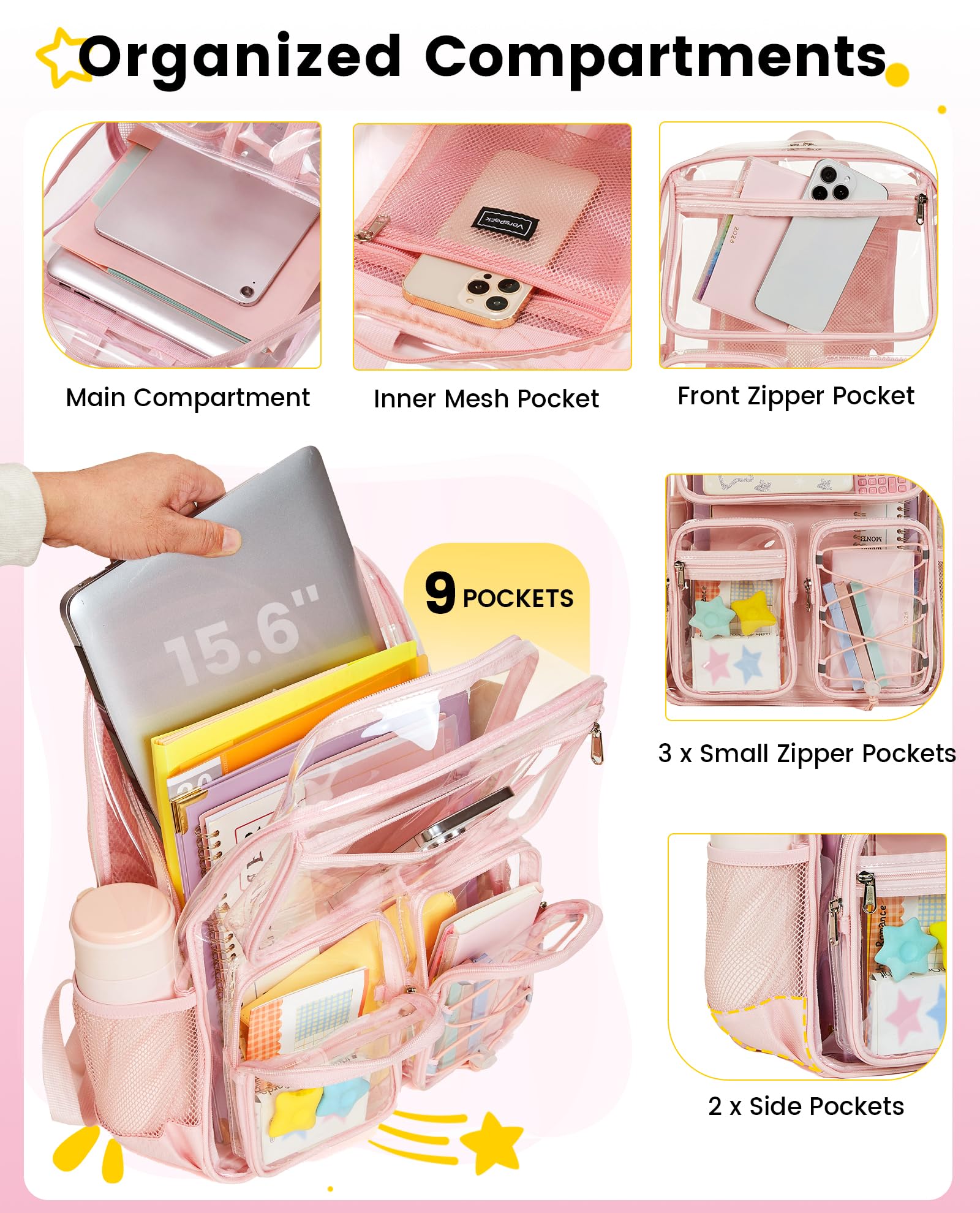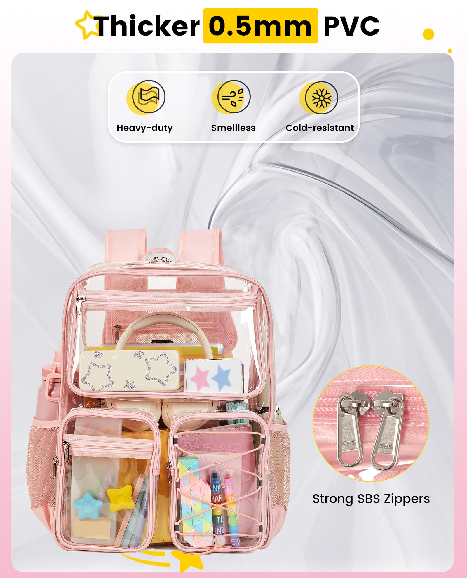 Quality Material & Reinforced Structure: Made of heavy-duty, 0.5mm-thick PVC and strong SBS zippers, these clear backpacks for school are water-resistant and built to last. Integrated support strips help the cute clear backpack maintain its shape and stand upright, even when lightly packed, making it easier to find your items quickly