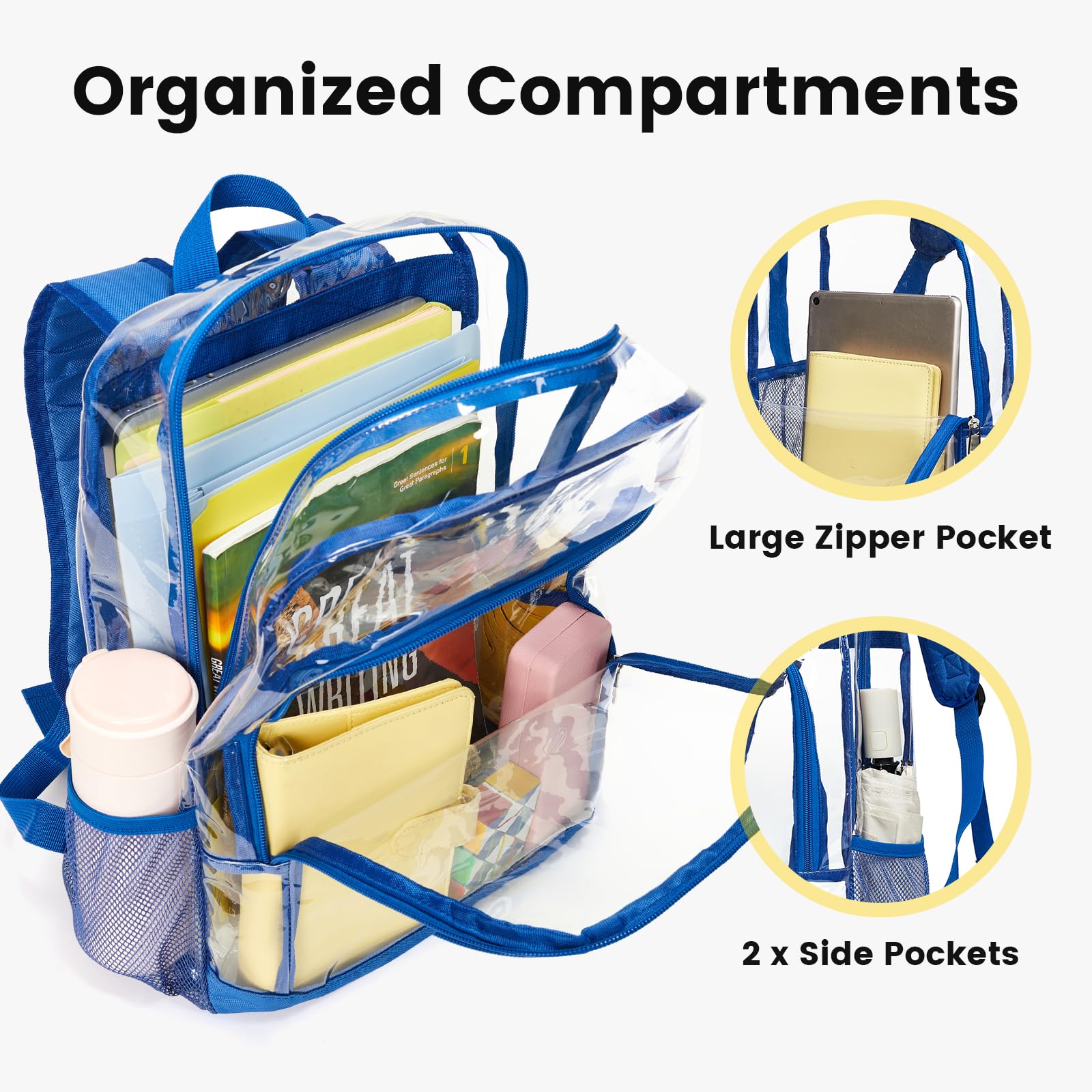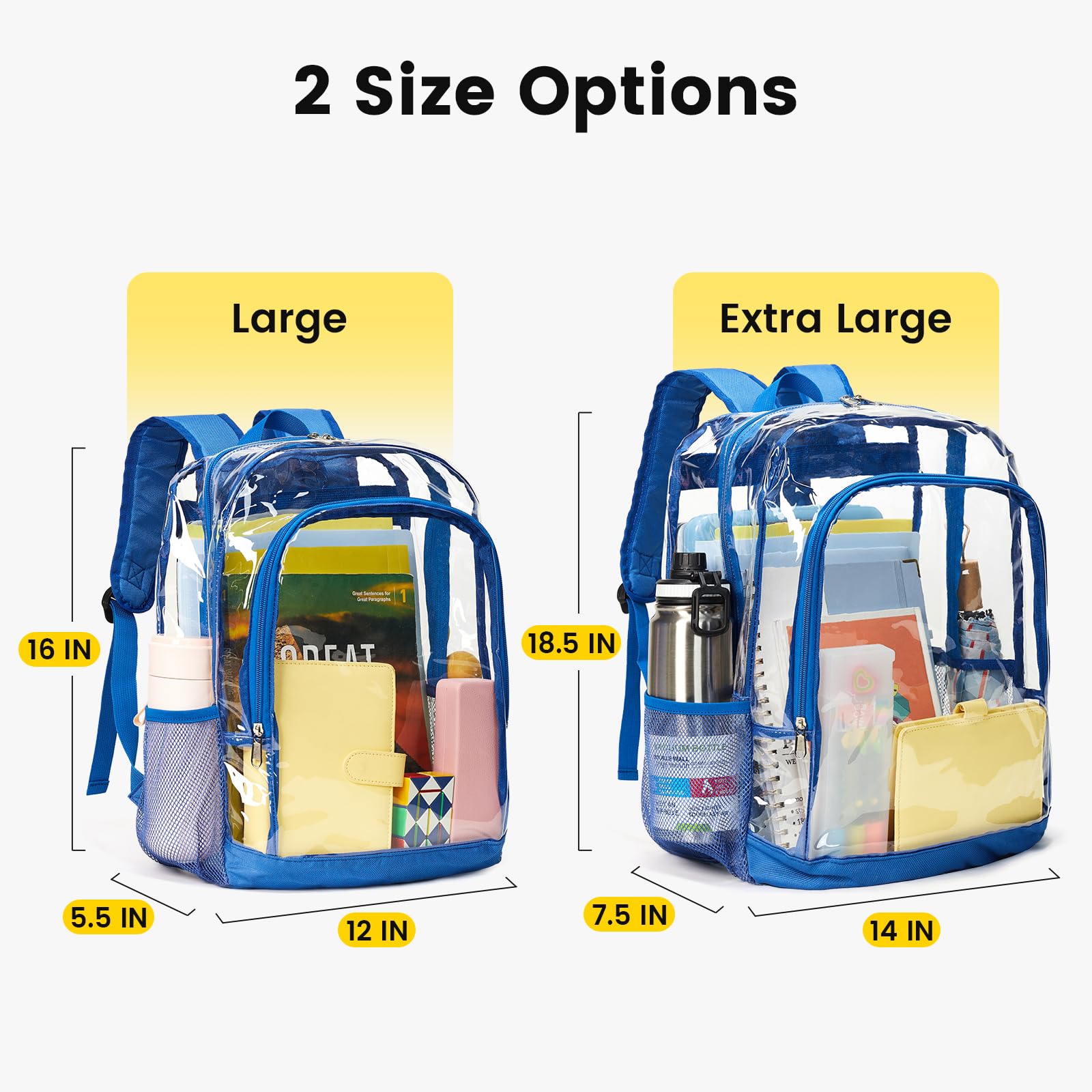 Large Capacity: Measuring 16" x 12" x 5.5", these clear backpacks for school feature a roomy main compartment for books, binders, lunch boxes, and extra clothes. A front zippered pocket fits notebooks or pencil cases, while two side mesh pockets of this clear book bag hold water bottles or umbrellas