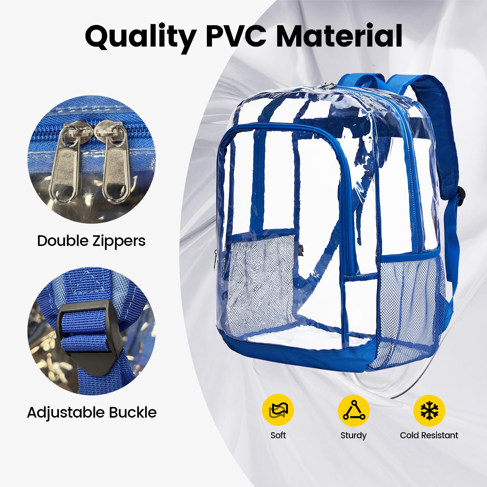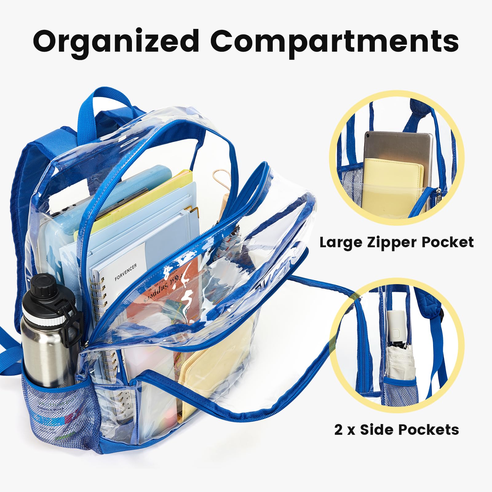 Large Capacity: Measuring 18.5" x 14" x 7.5", these clear backpacks for school feature a roomy main compartment for books, binders, lunch boxes, and extra clothes. A front zippered pocket fits notebooks or pencil cases, while two side mesh pockets of this clear book bag hold water bottles or umbrellas